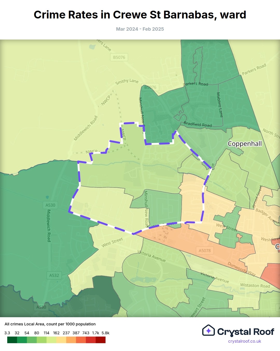 The figures in grey indicate the relative ratings of Crewe St Barnabas (ward) for a specific crime type compared to other wards in England and Wales.