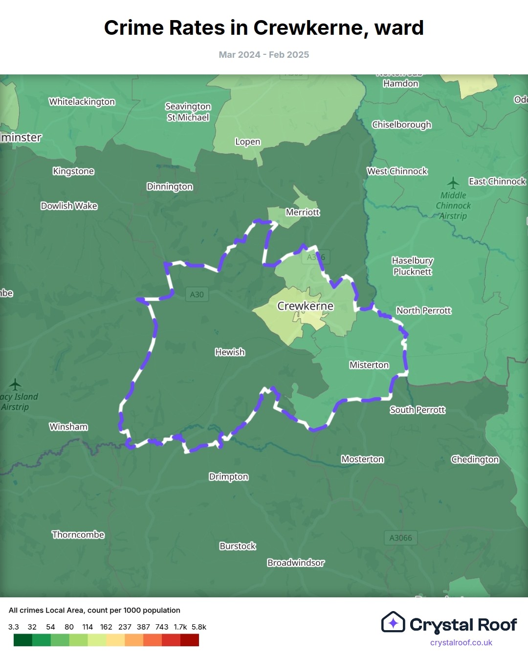 Crewkerne, (ward) includes areas with the following crime ratings (see map):