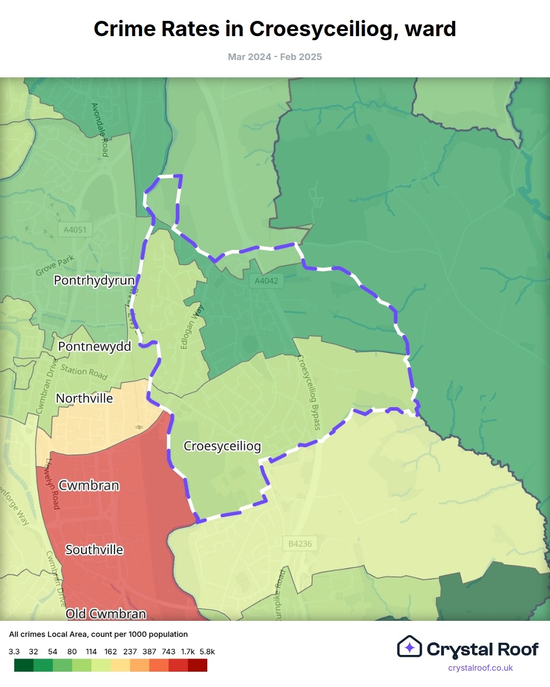 Croesyceiliog, (ward) includes areas with the following crime ratings (see map):