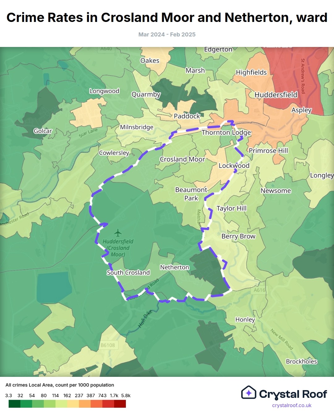 Crosland Moor and Netherton, (ward) includes areas with the following crime ratings (see map):