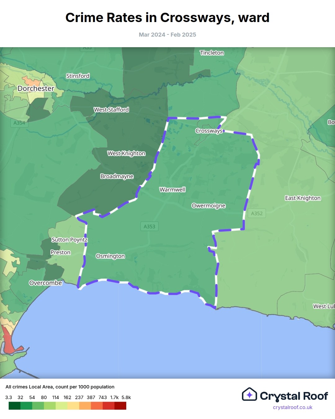 Crossways, (ward) includes areas with the following crime ratings (see map):