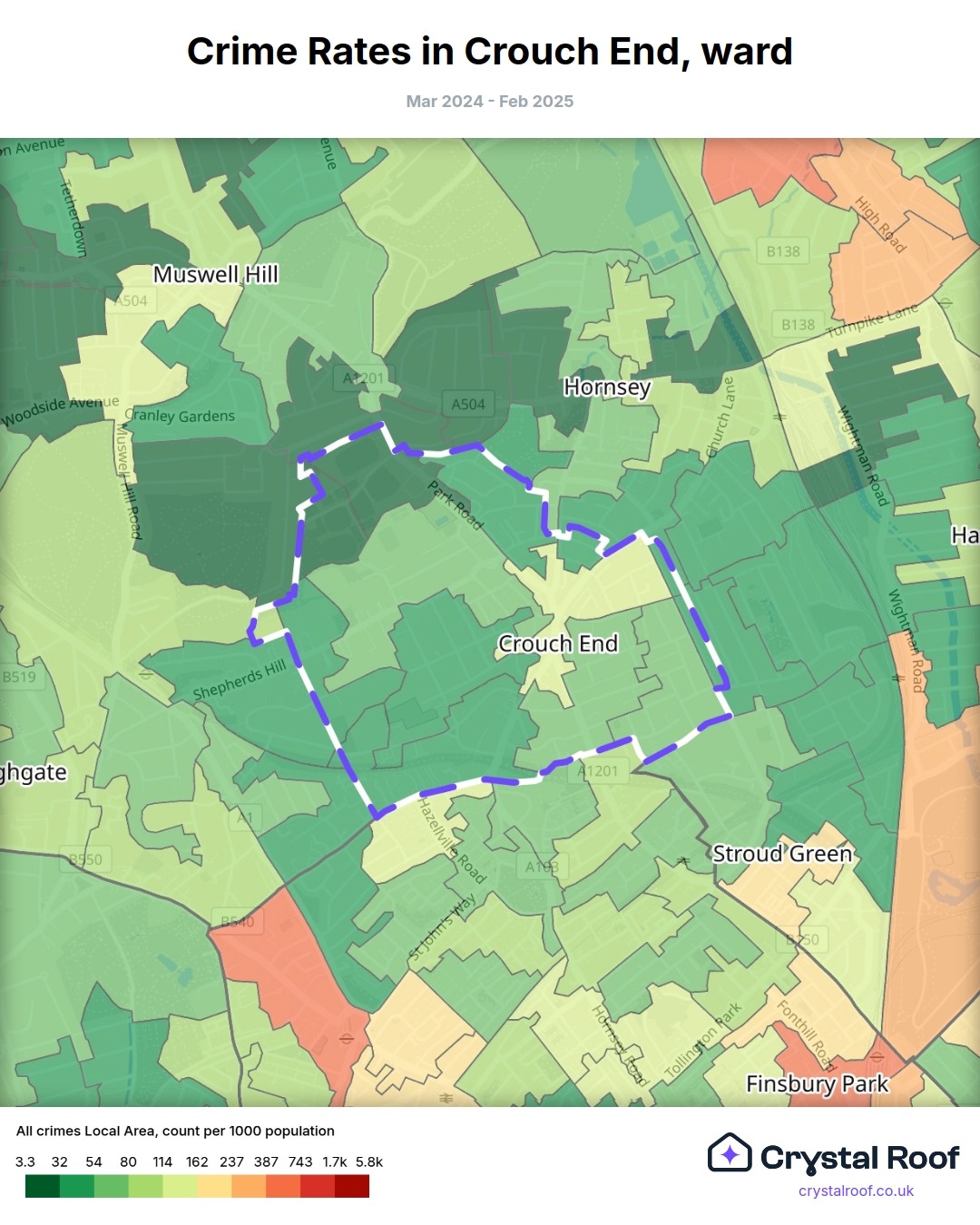 Crouch End, (ward) includes areas with the following crime ratings (see map):