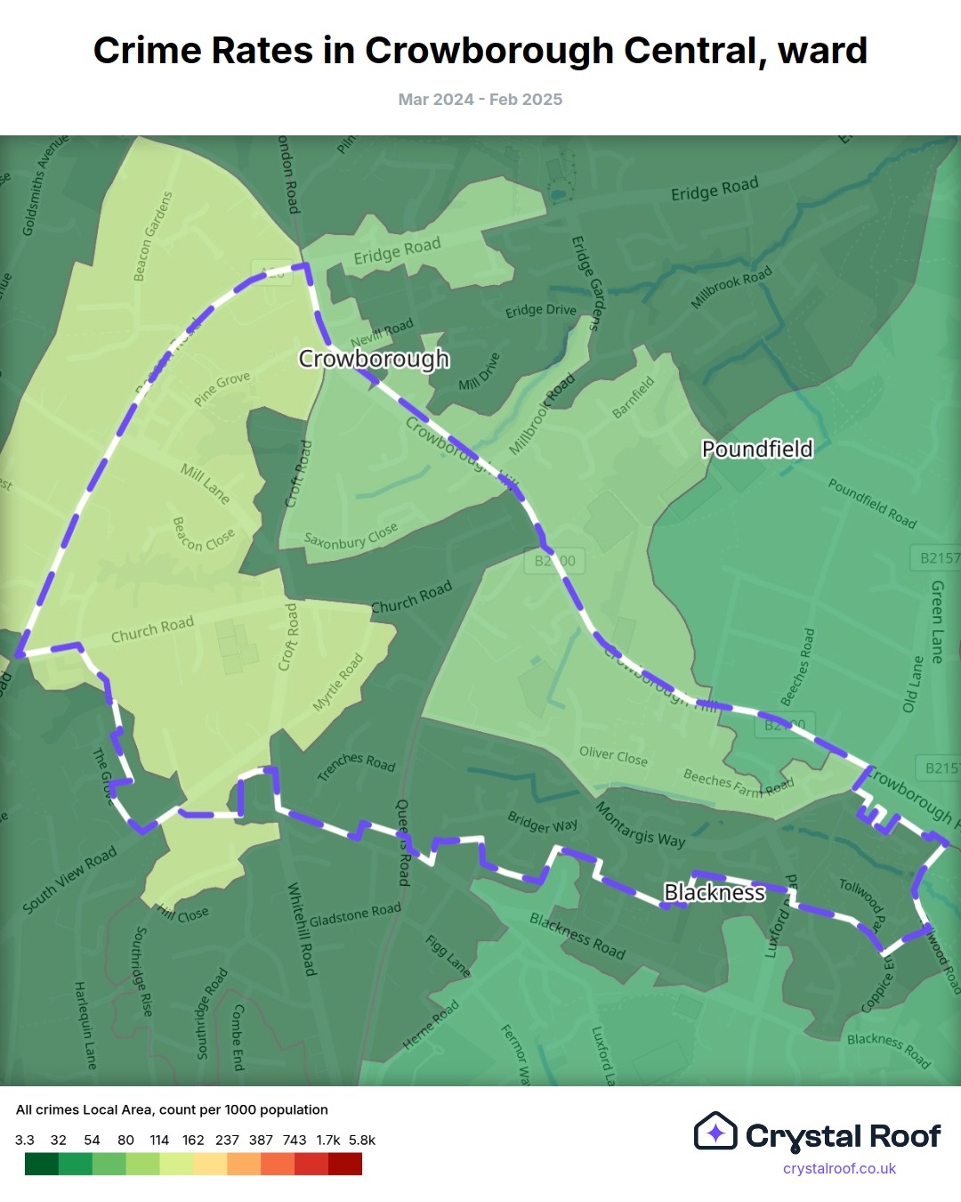 Crowborough Central, (ward) includes areas with the following crime ratings (see map):