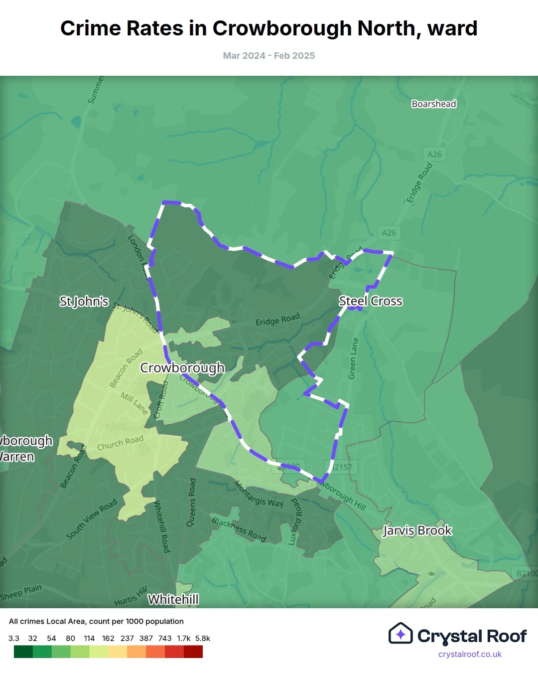 Crowborough North, (ward) includes areas with the following crime ratings (see map):