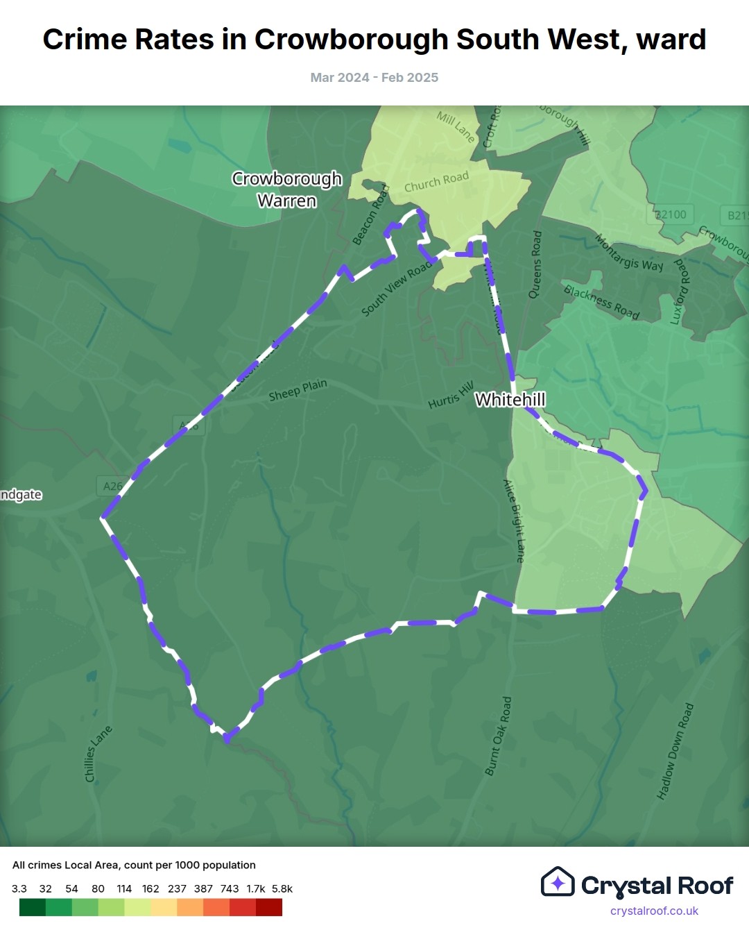 The figures in grey indicate the relative ratings of Crowborough South West (ward) for a specific crime type compared to other wards in England and Wales.