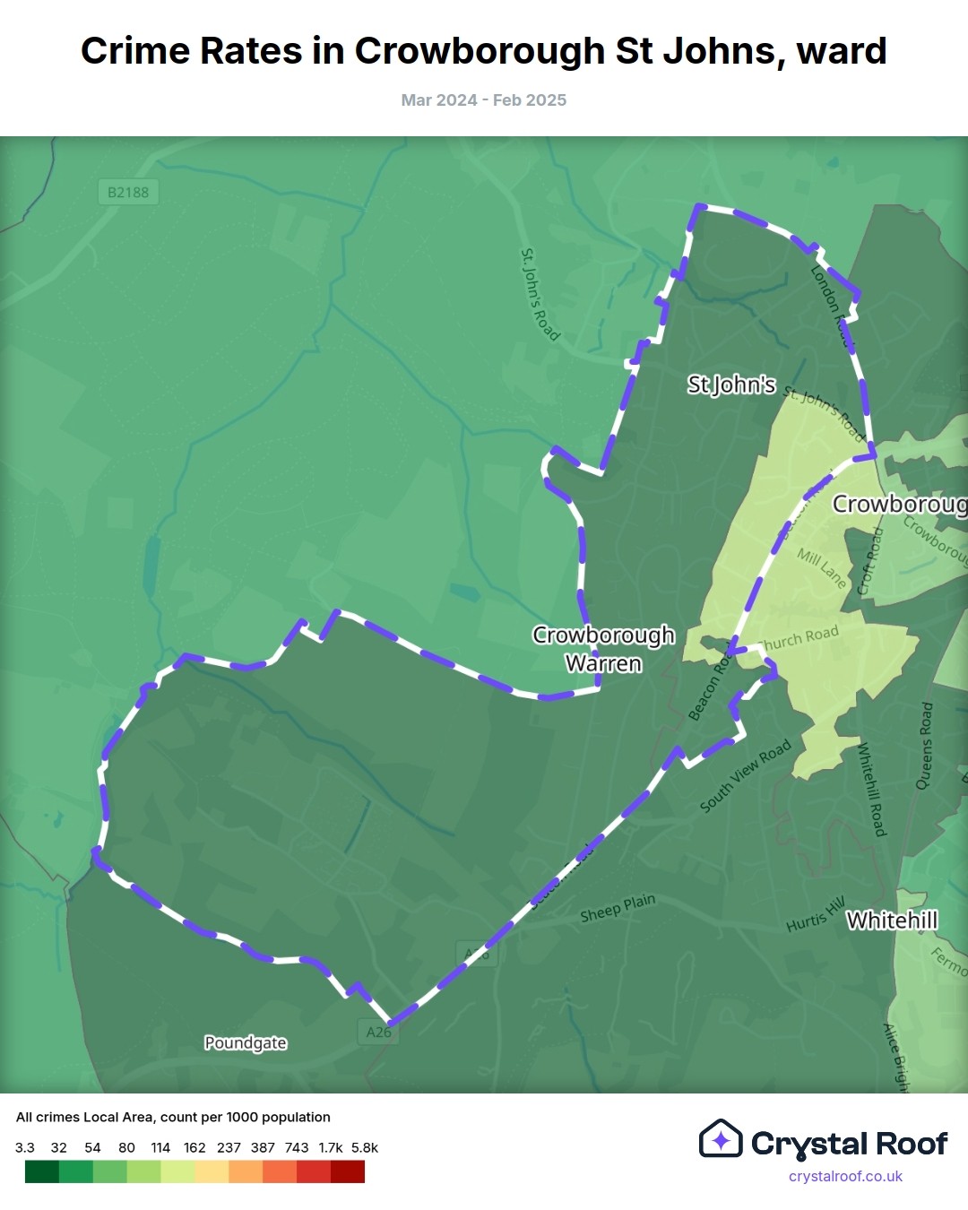 Crowborough St Johns, (ward) includes areas with the following crime ratings (see map):