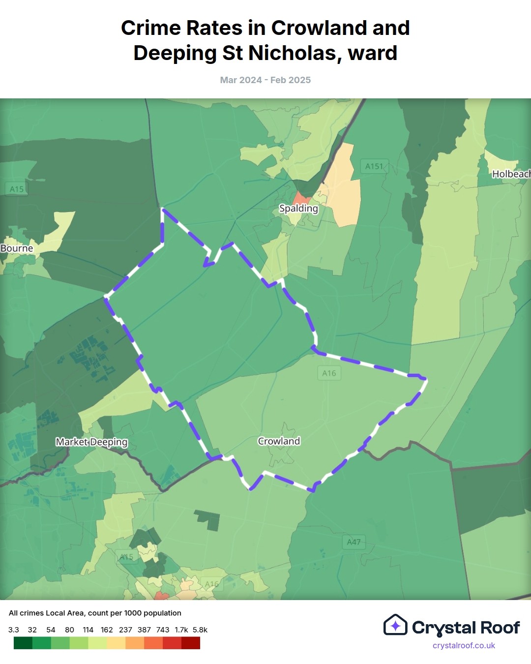 Crowland and Deeping St Nicholas, (ward) includes areas with the following crime ratings (see map):