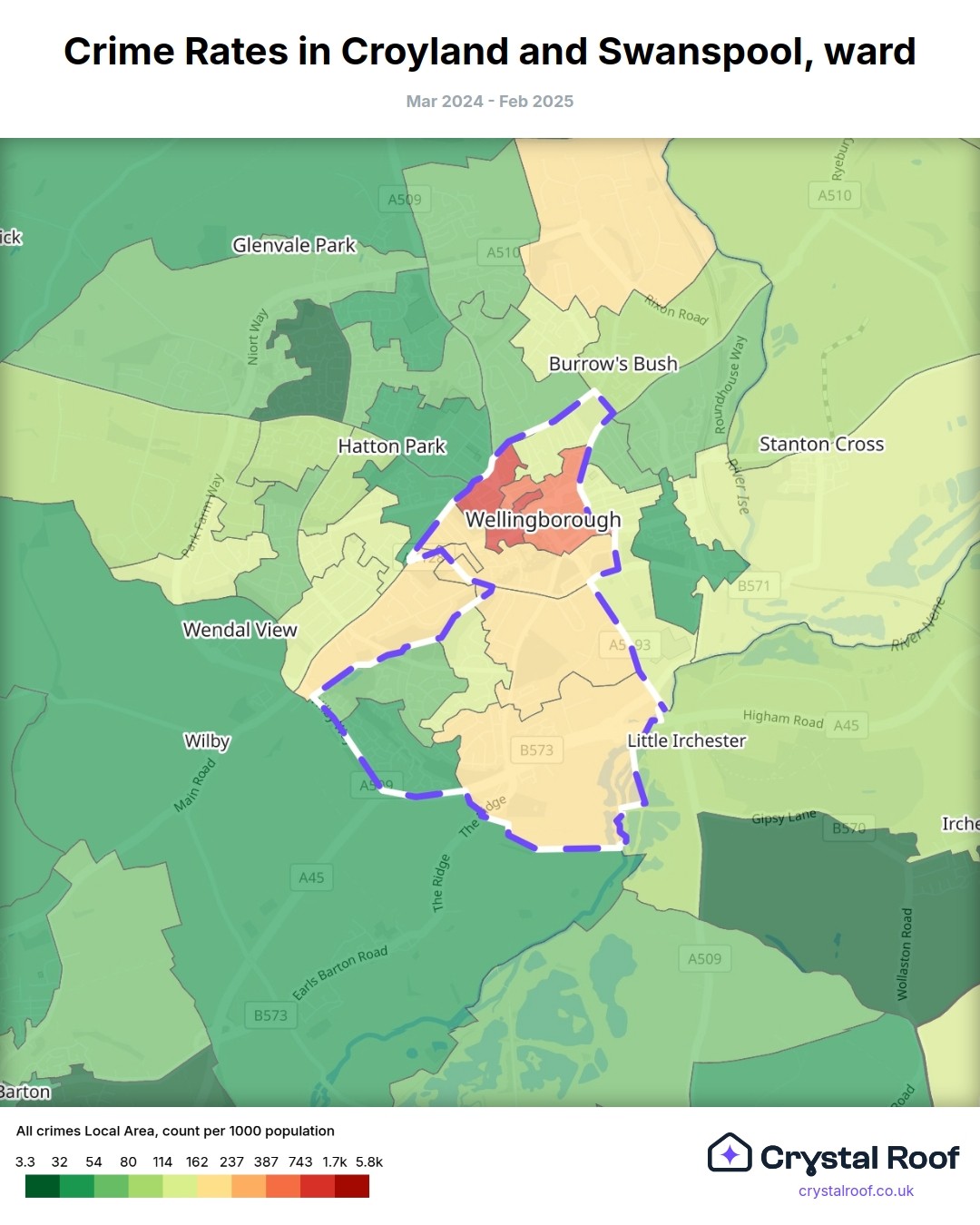Croyland & Swanspool (ward) is located within North Northamptonshire (borough). Annual total crime rate in North Northamptonshire (borough) is 95 crimes per thousand resident population, which can be rated as 4 out of 10 or low crime level compared to other local authority districts in England and Wales.