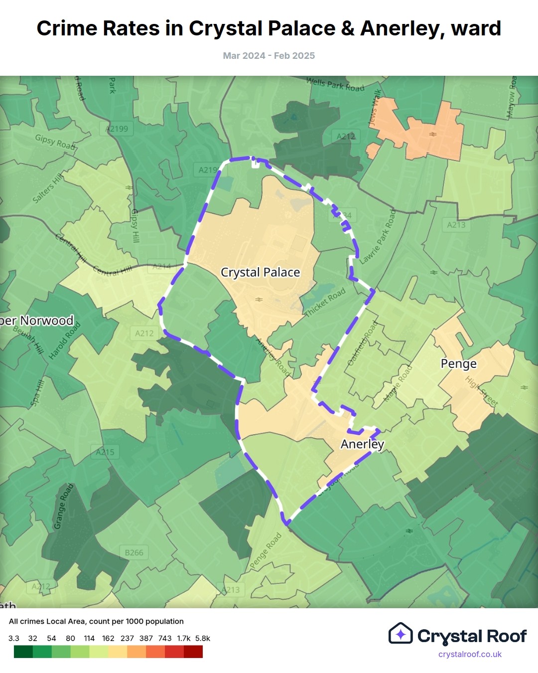 The figures in grey indicate the relative ratings of Crystal Palace & Anerley (ward) for a specific crime type compared to other wards in England and Wales.