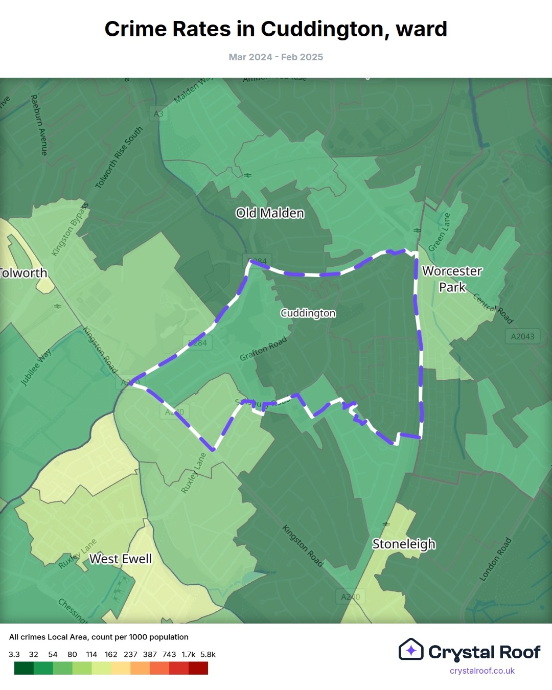 Cuddington, (ward) includes areas with the following crime ratings (see map):