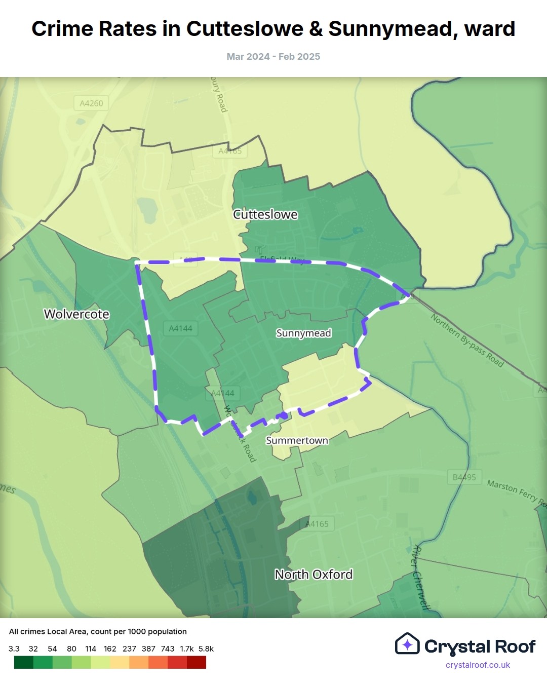Cutteslowe & Sunnymead, (ward) includes areas with the following crime ratings (see map):
