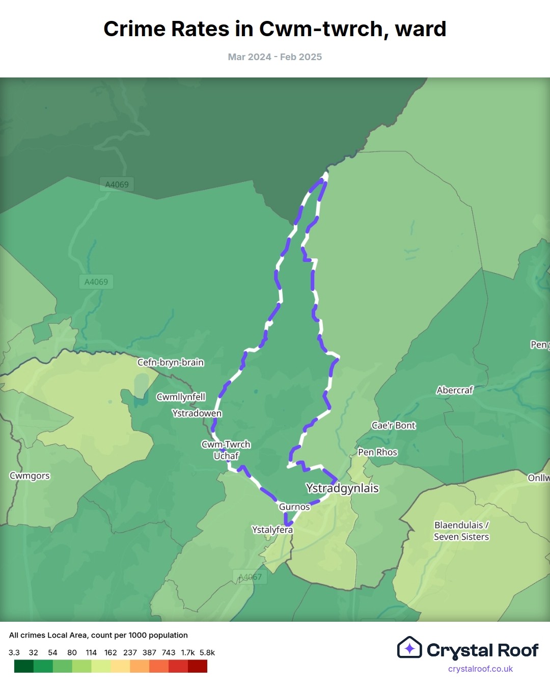 Cwm-twrch, (ward) includes areas with the following crime ratings (see map):