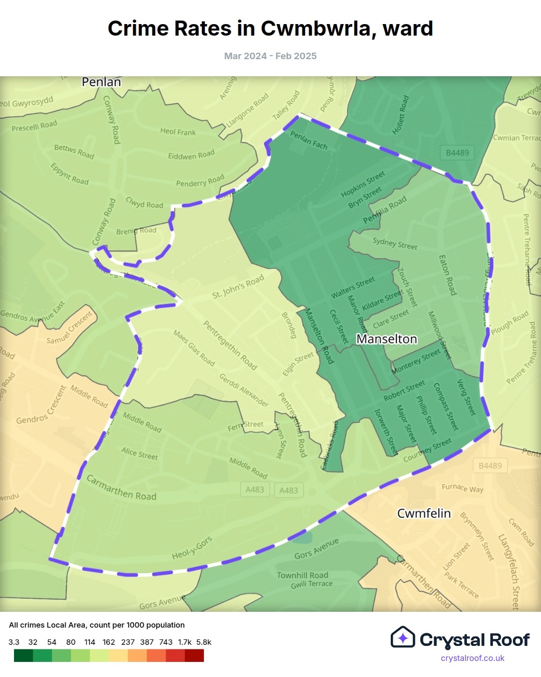 Cwmbwrla, (ward) includes areas with the following crime ratings (see map):