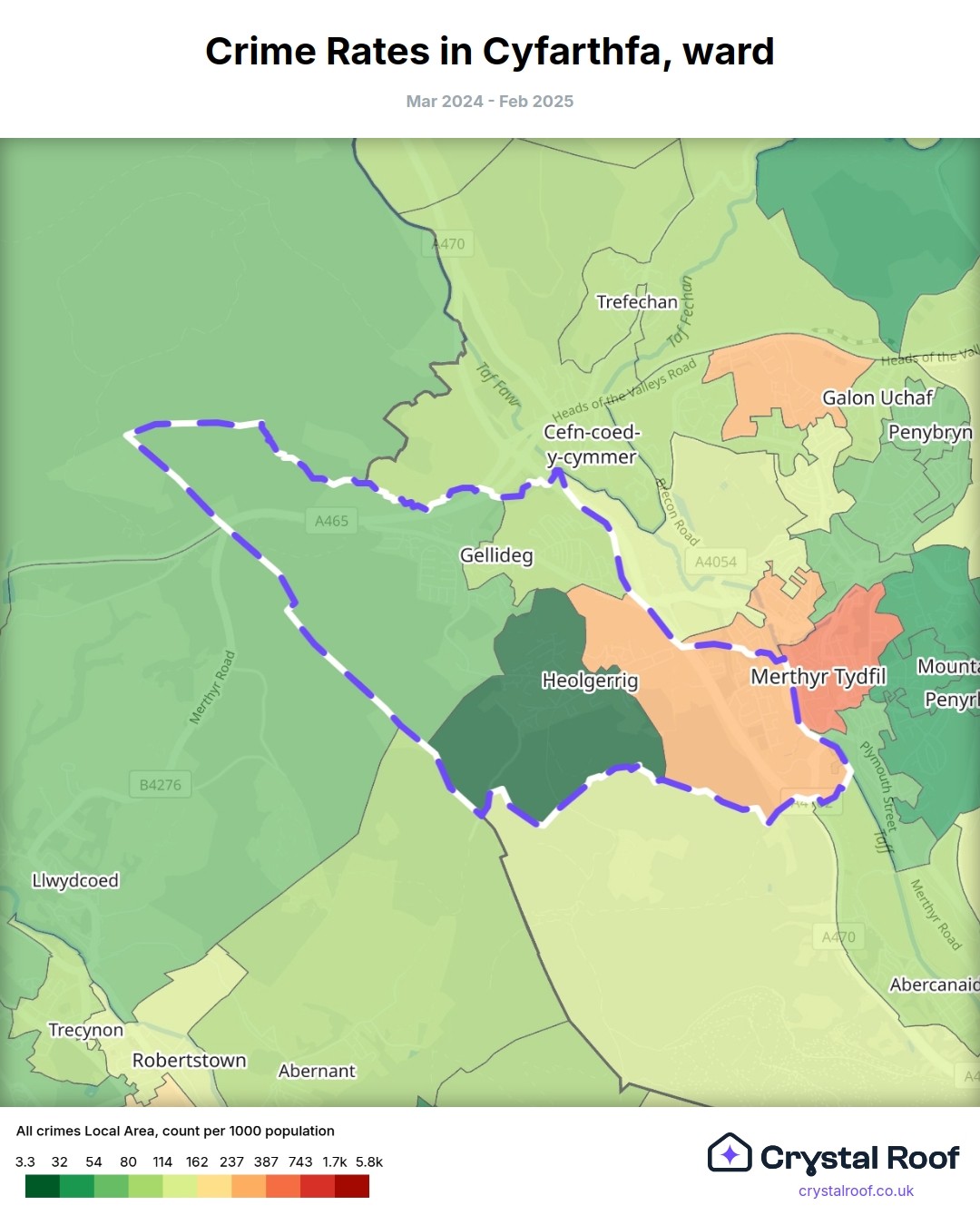 Cyfarthfa, (ward) includes areas with the following crime ratings (see map):
