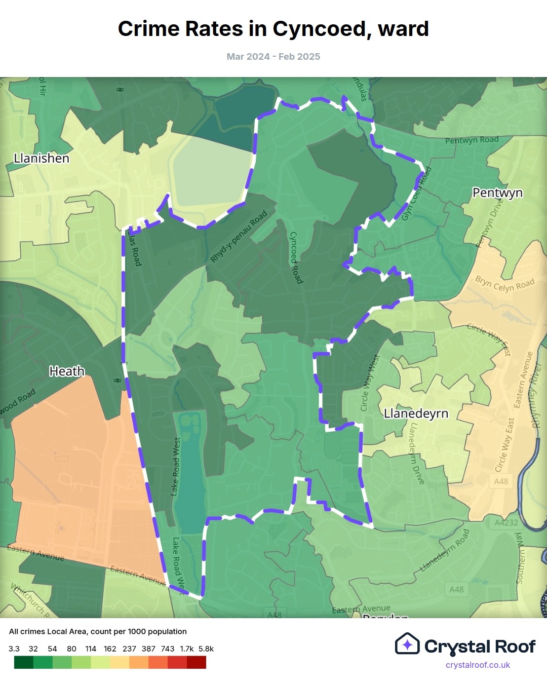 Cyncoed, (ward) includes areas with the following crime ratings (see map):