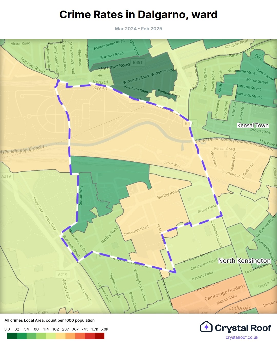 Dalgarno (ward) is located within Kensington and Chelsea (borough). Annual total crime rate in Kensington and Chelsea (borough) is 192 crimes per thousand resident population, which can be rated as 8 out of 10 or high crime level compared to other local authority districts in England and Wales.