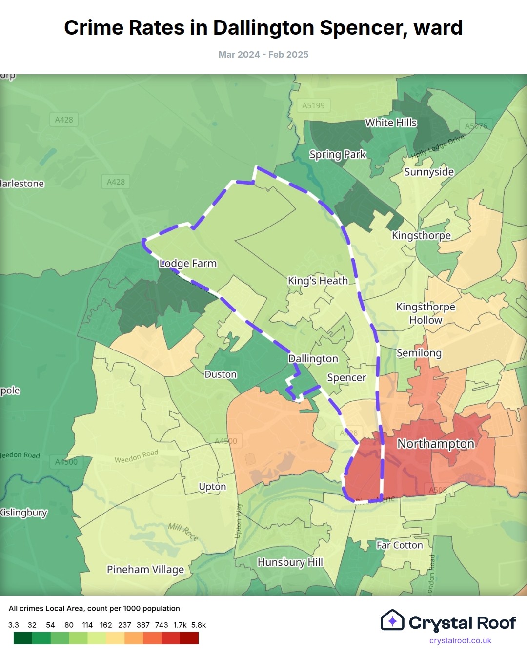 Dallington Spencer (ward) is located within West Northamptonshire (borough). Annual total crime rate in West Northamptonshire (borough) is 94 crimes per thousand resident population, which can be rated as 4 out of 10 or low crime level compared to other local authority districts in England and Wales.