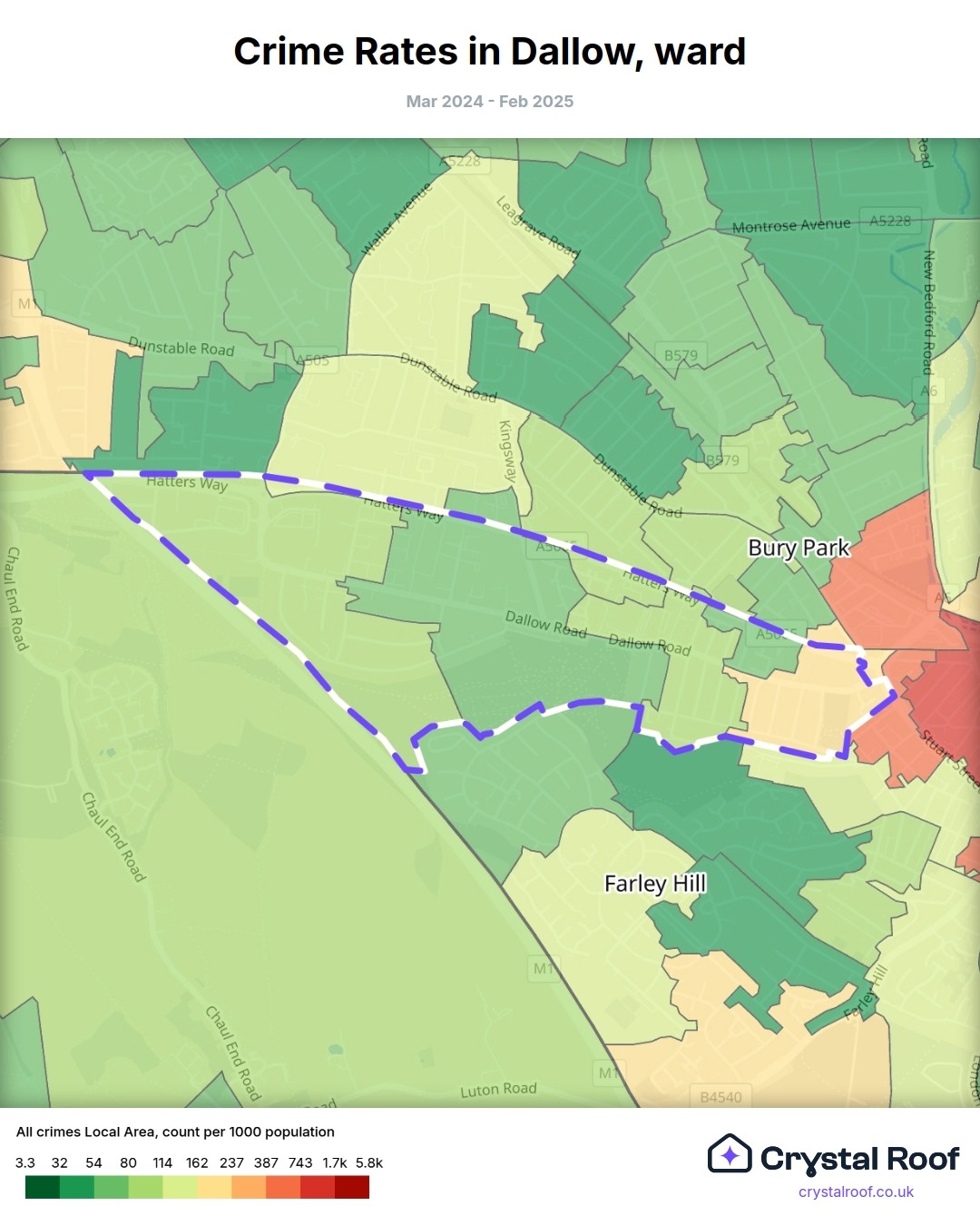 Dallow (ward) is located within Luton (borough). Annual total crime rate in Luton (borough) is 101 crimes per thousand resident population, which can be rated as 4 out of 10 or low crime level compared to other local authority districts in England and Wales.