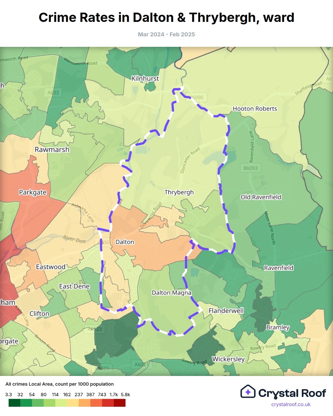 The figures in grey indicate the relative ratings of Dalton & Thrybergh (ward) for a specific crime type compared to other wards in England and Wales.