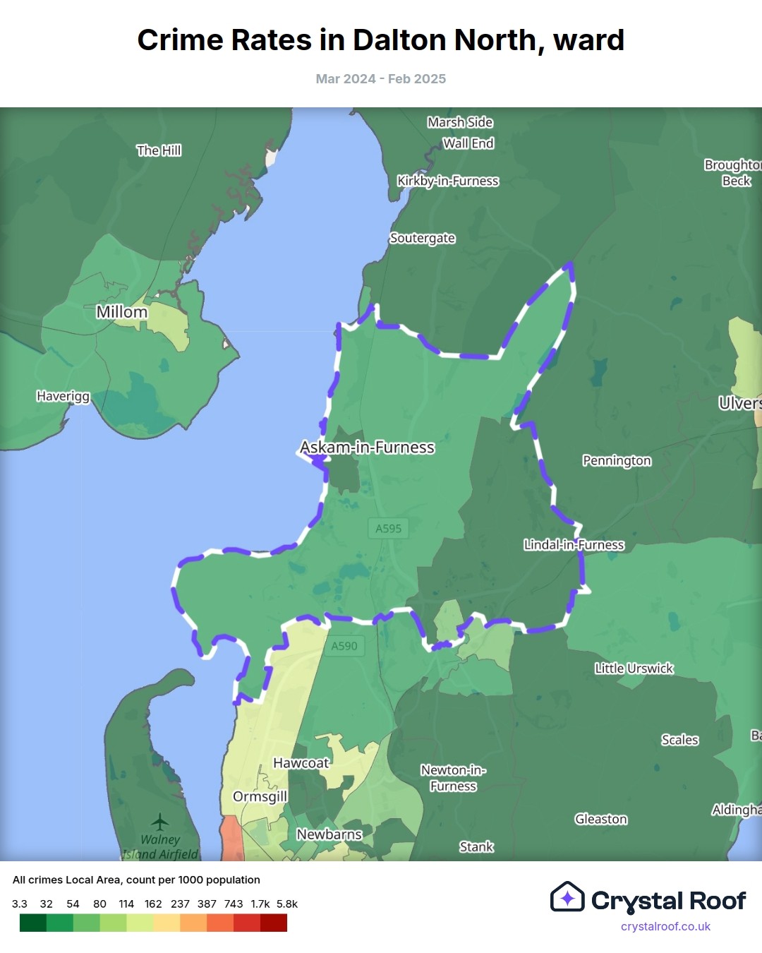 Dalton North (ward) is located within Westmorland and Furness (borough). Annual total crime rate in Westmorland and Furness (borough) is 42.6 crimes per thousand resident population, which can be rated as 1 out of 10 or low crime level compared to other local authority districts in England and Wales.