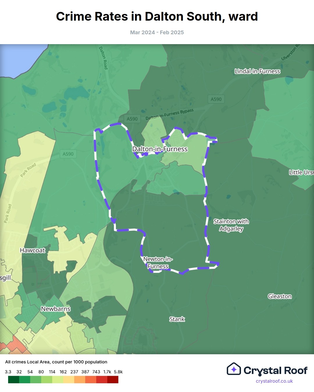 Dalton South (ward) is located within Westmorland and Furness (borough). Annual total crime rate in Westmorland and Furness (borough) is 42.6 crimes per thousand resident population, which can be rated as 1 out of 10 or low crime level compared to other local authority districts in England and Wales.