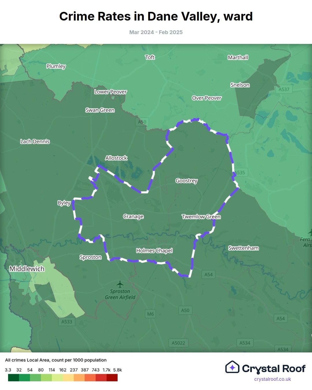 Dane Valley, (ward) includes areas with the following crime ratings (see map):