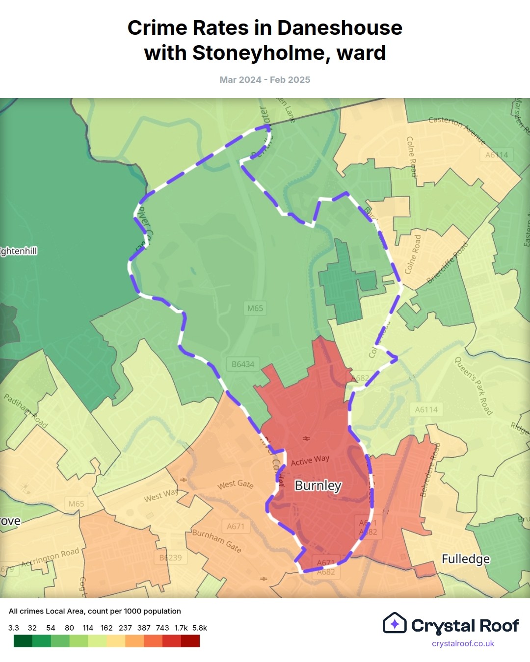 Daneshouse with Stoneyholme (ward) is located within Burnley (borough). Annual total crime rate in Burnley (borough) is 148 crimes per thousand resident population, which can be rated as 7 out of 10 or high crime level compared to other local authority districts in England and Wales.