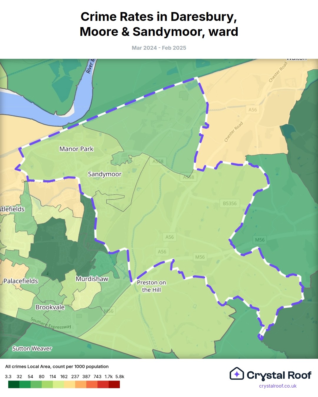 Daresbury, Moore & Sandymoor, (ward) includes areas with the following crime ratings (see map):