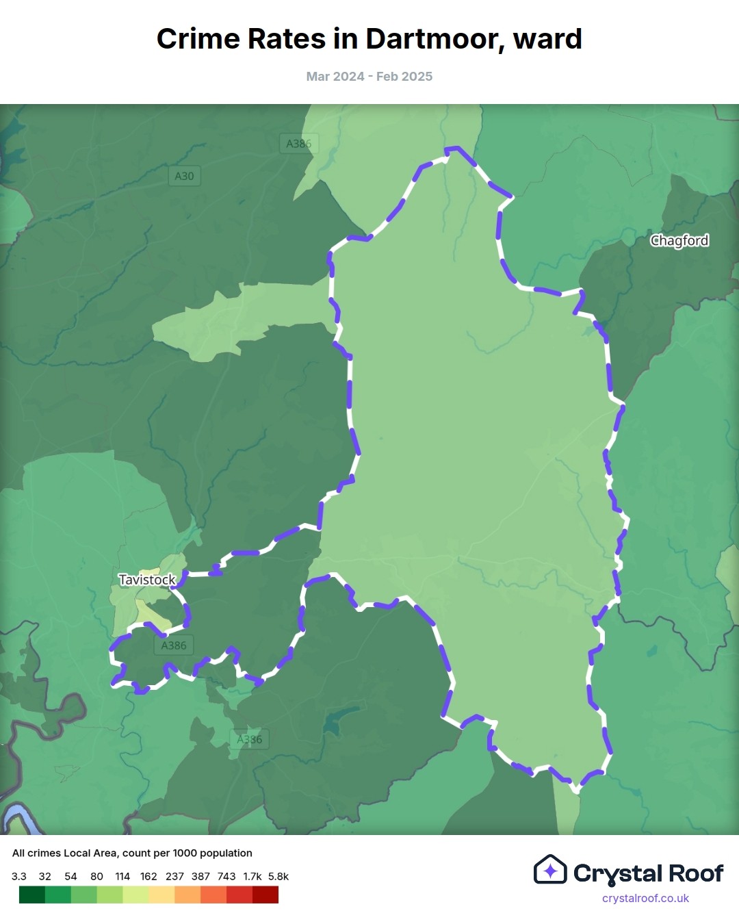 Dartmoor (ward) is located within West Devon (borough). Annual total crime rate in West Devon (borough) is 45.8 crimes per thousand resident population, which can be rated as 1 out of 10 or low crime level compared to other local authority districts in England and Wales.