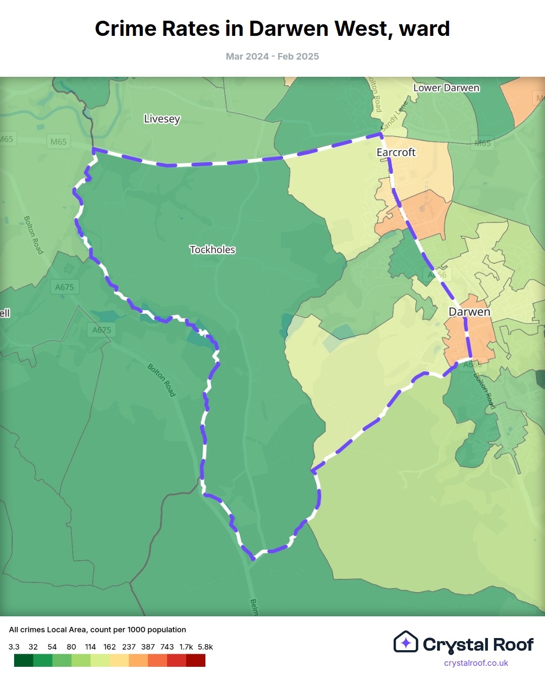 The figures in grey indicate the relative ratings of Darwen West (ward) for a specific crime type compared to other wards in England and Wales.