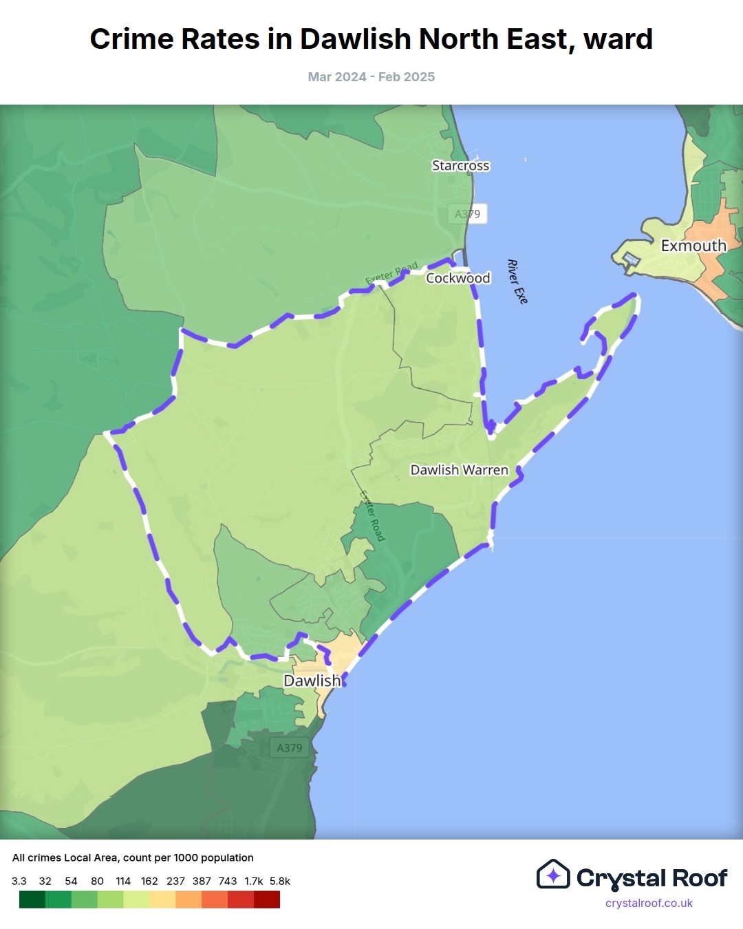 Dawlish North East, (ward) includes areas with the following crime ratings (see map):