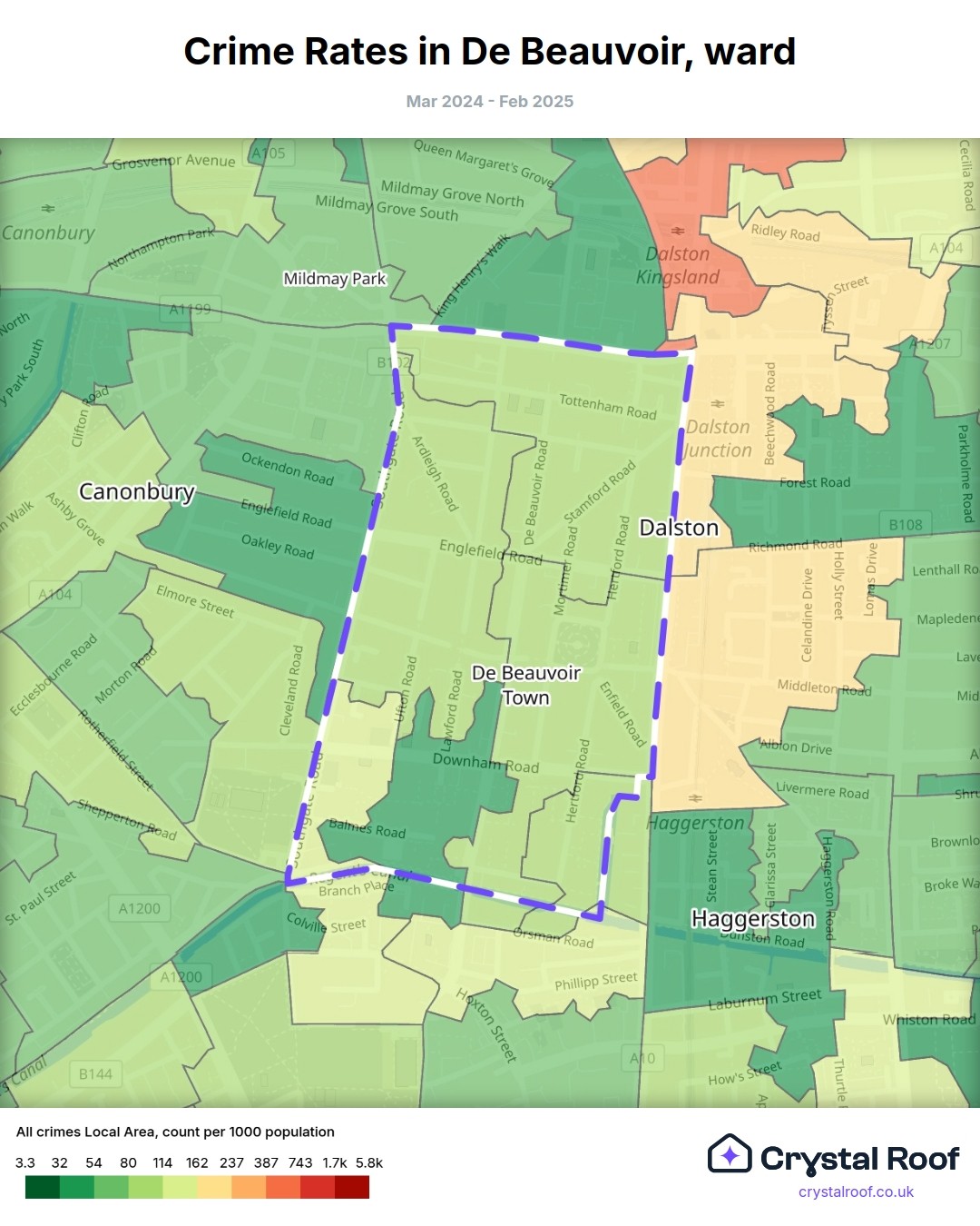De Beauvoir, (ward) includes areas with the following crime ratings (see map):