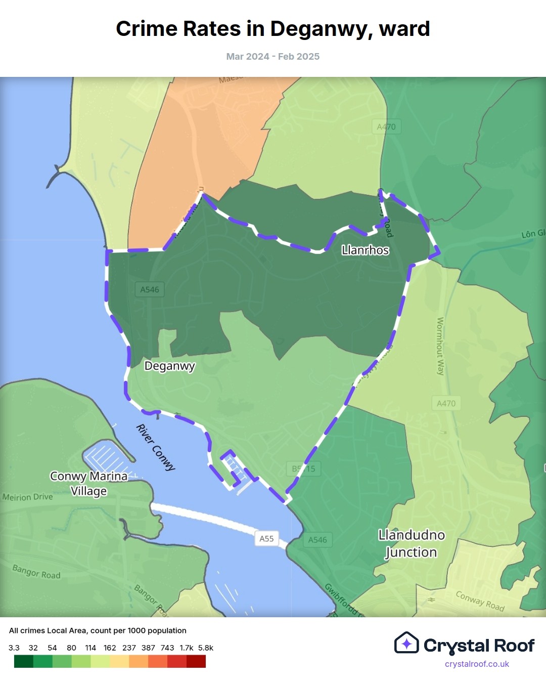 Deganwy, (ward) includes areas with the following crime ratings (see map):