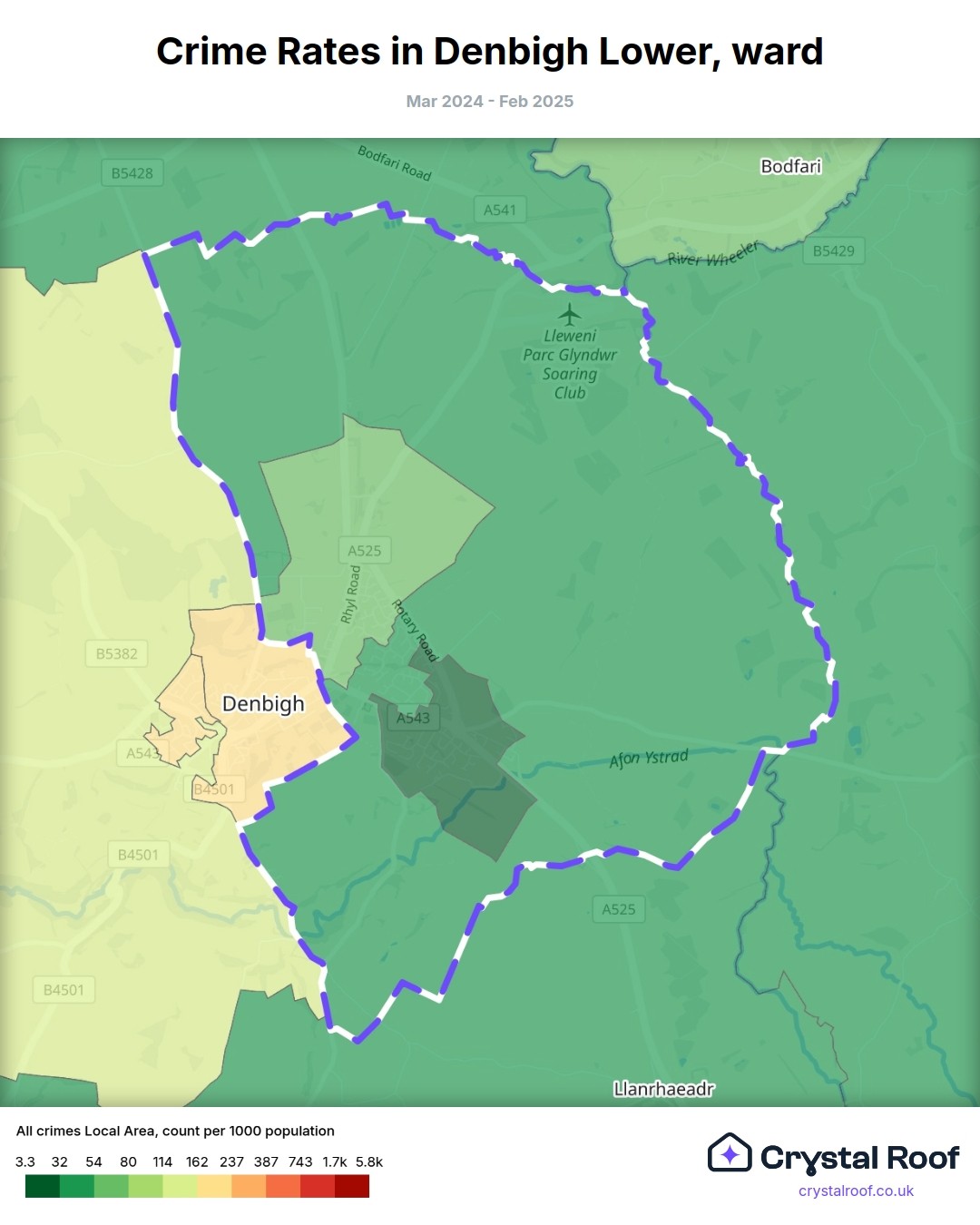 Denbigh Lower (ward) is located within Denbighshire (borough). Annual total crime rate in Denbighshire (borough) is 116 crimes per thousand resident population, which can be rated as 6 out of 10 or medium crime level compared to other local authority districts in England and Wales.