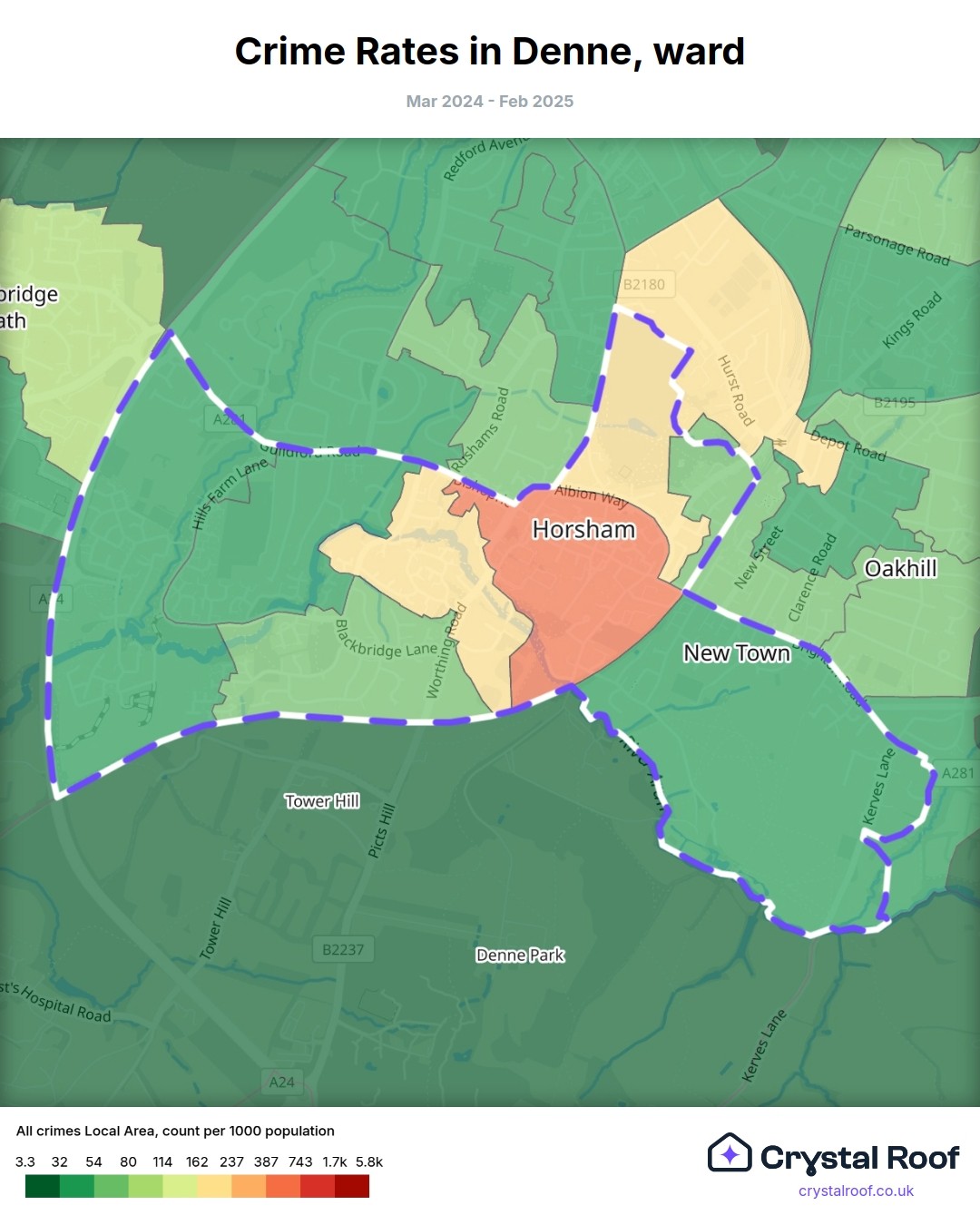 Denne (ward) is located within Horsham (borough). Annual total crime rate in Horsham (borough) is 54.1 crimes per thousand resident population, which can be rated as 1 out of 10 or low crime level compared to other local authority districts in England and Wales.