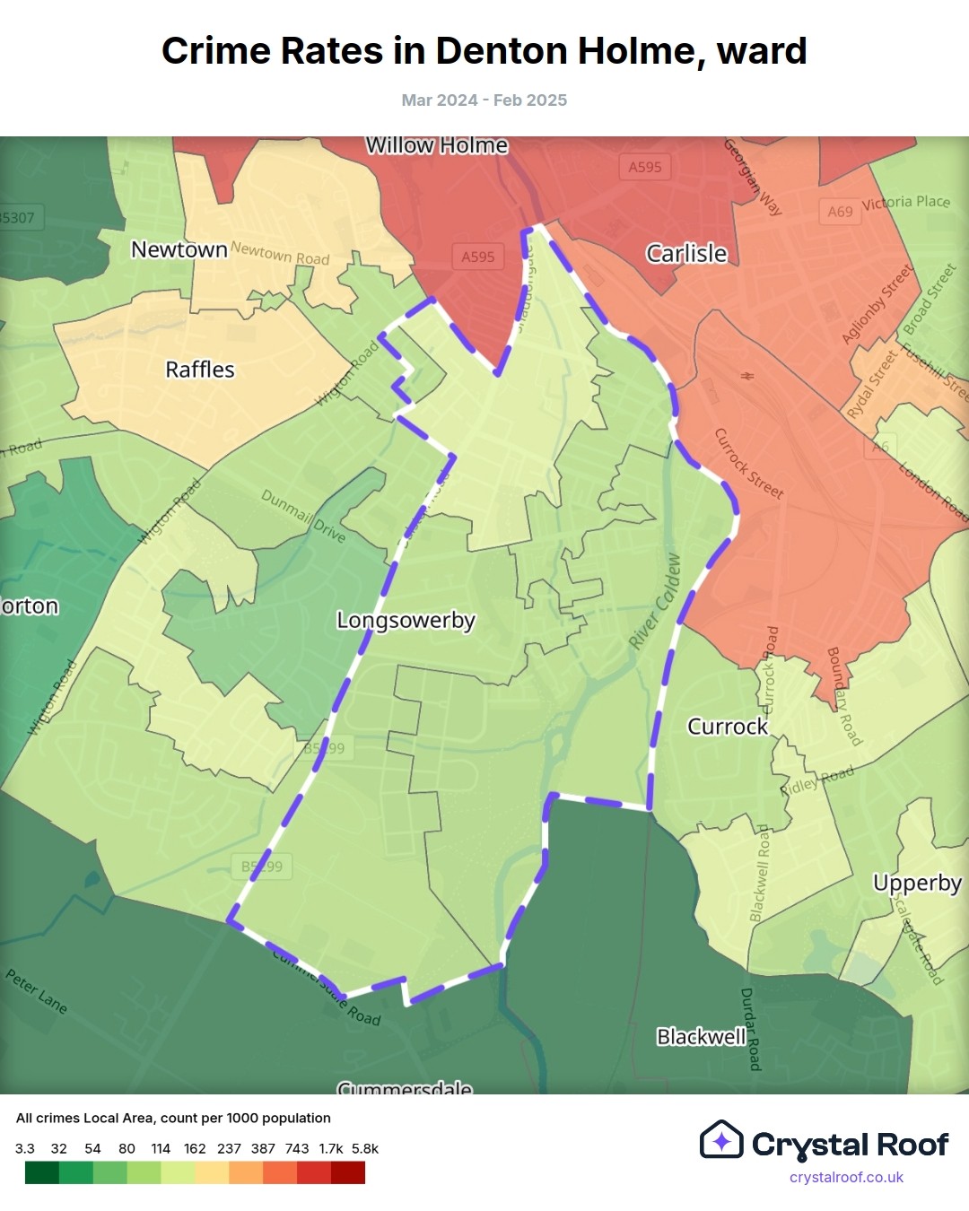 Denton Holme, (ward) includes areas with the following crime ratings (see map):