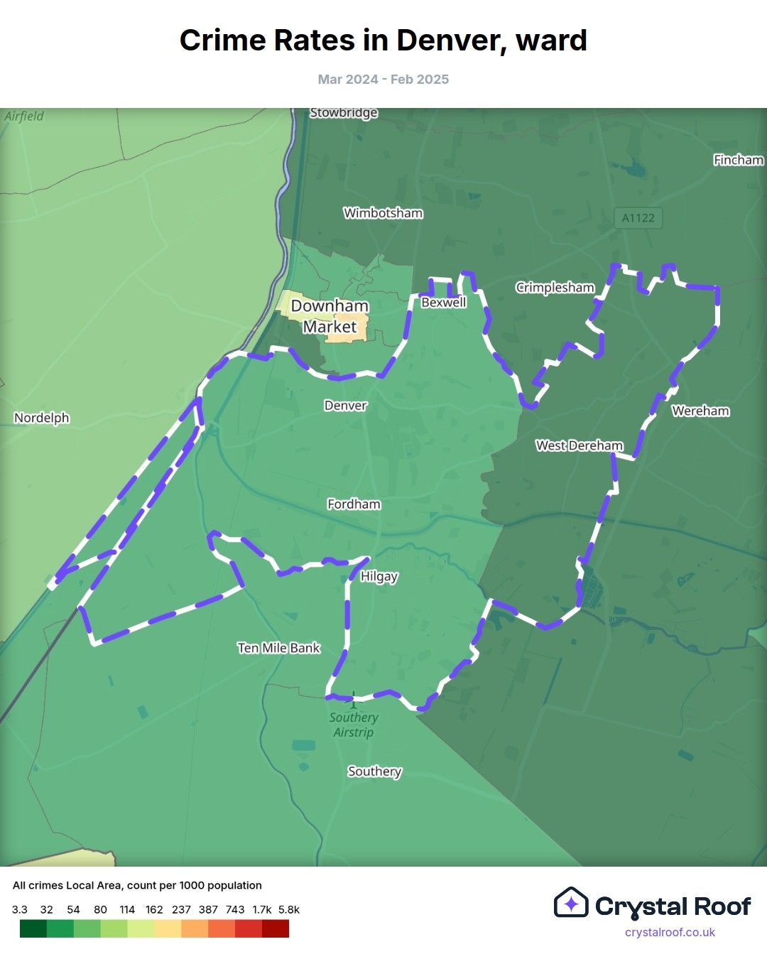 Denver (ward) is located within King's Lynn and West Norfolk (borough). Annual total crime rate in King's Lynn and West Norfolk (borough) is 68 crimes per thousand resident population, which can be rated as 2 out of 10 or low crime level compared to other local authority districts in England and Wales.