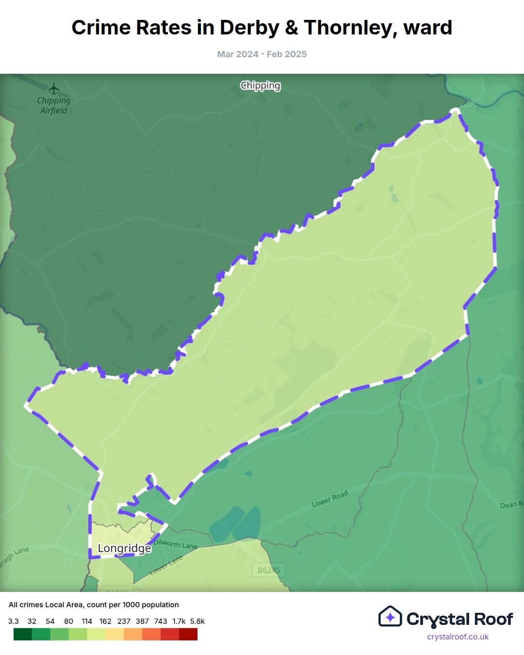 Derby & Thornley, (ward) includes areas with the following crime ratings (see map):