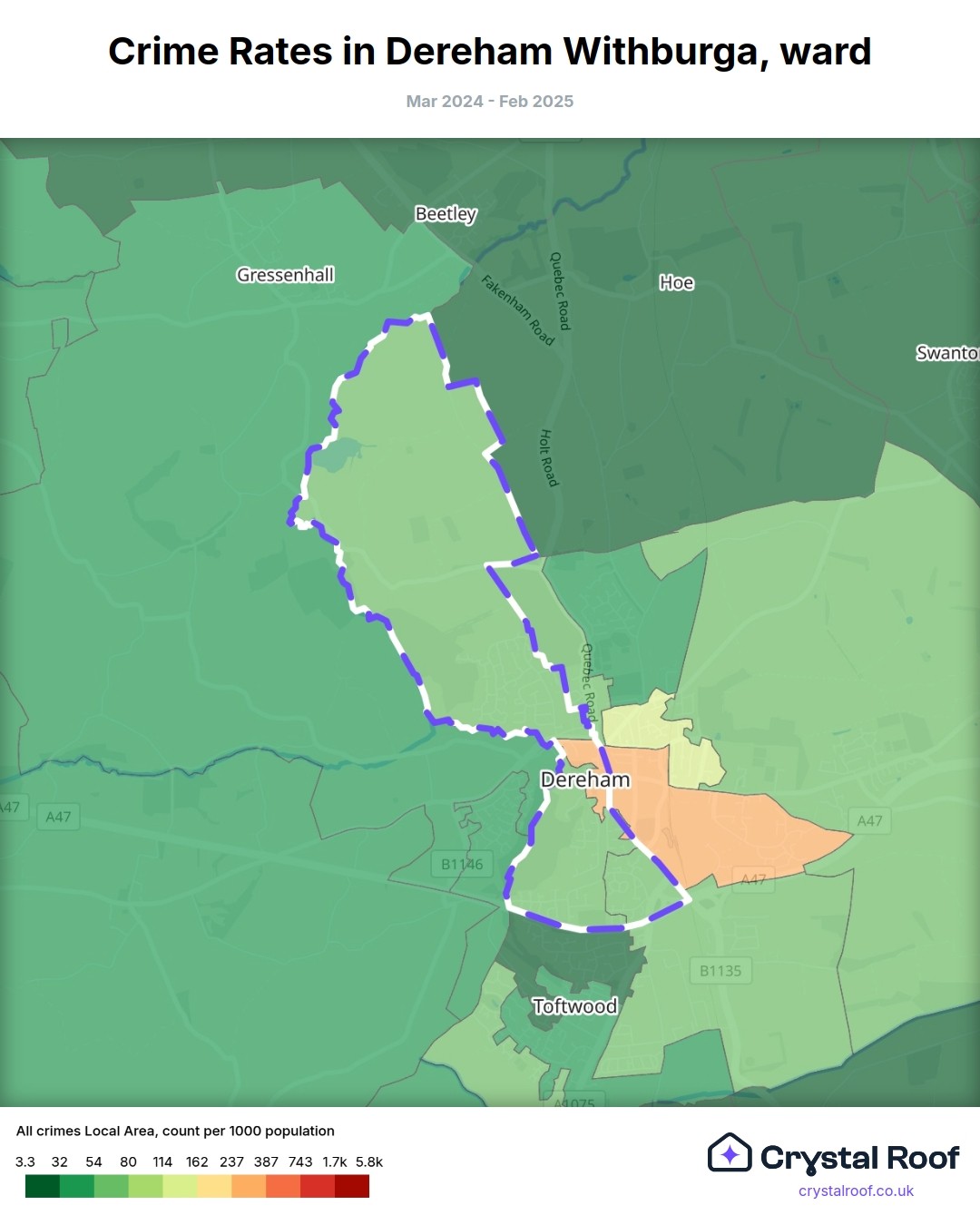Dereham Withburga, (ward) includes areas with the following crime ratings (see map):