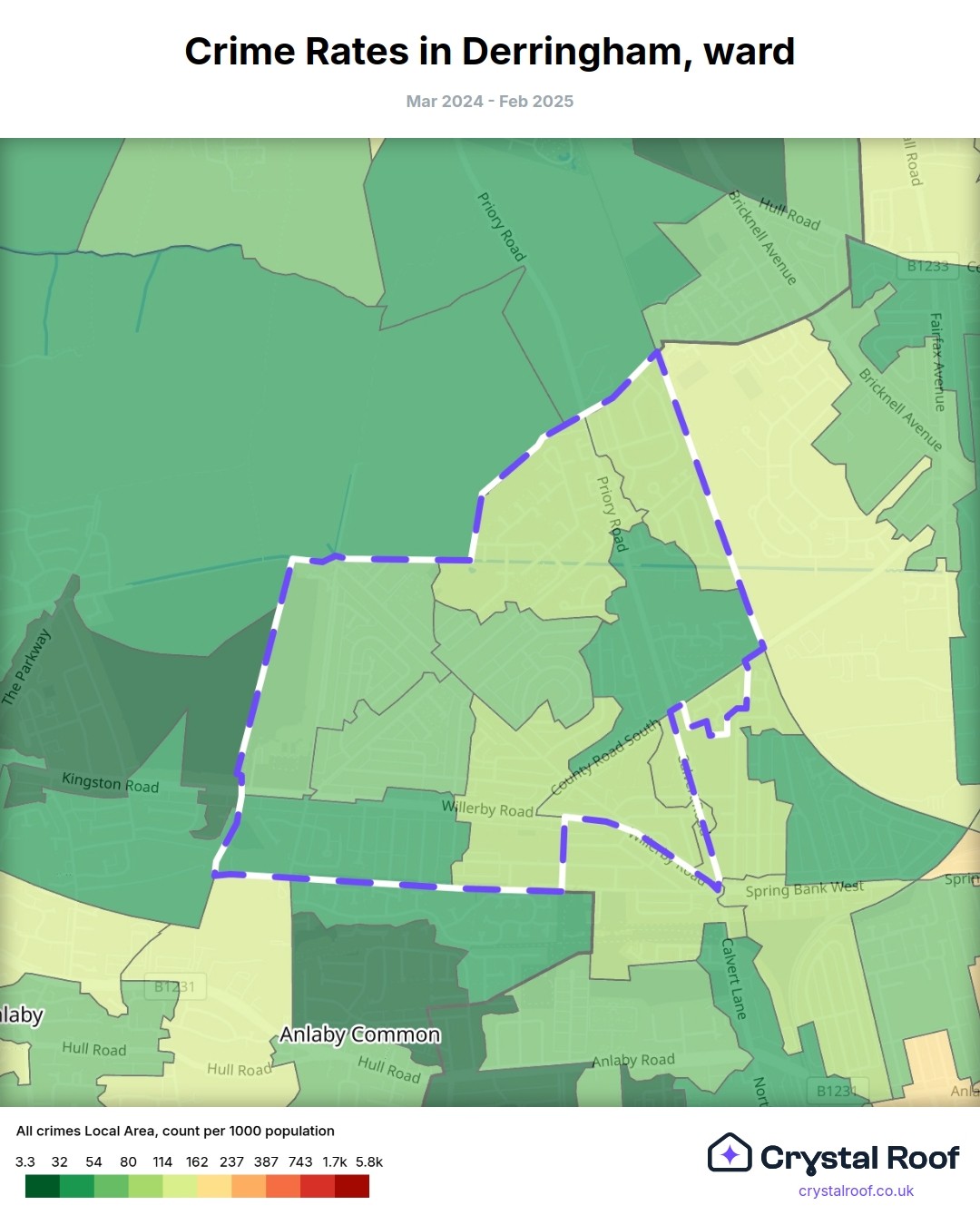 Derringham, (ward) includes areas with the following crime ratings (see map):