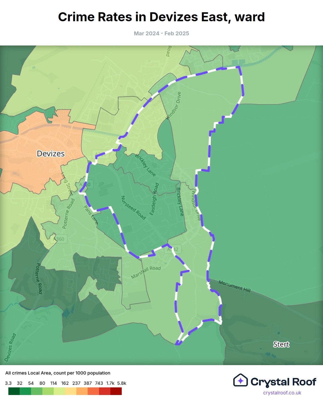 Devizes East, (ward) includes areas with the following crime ratings (see map):