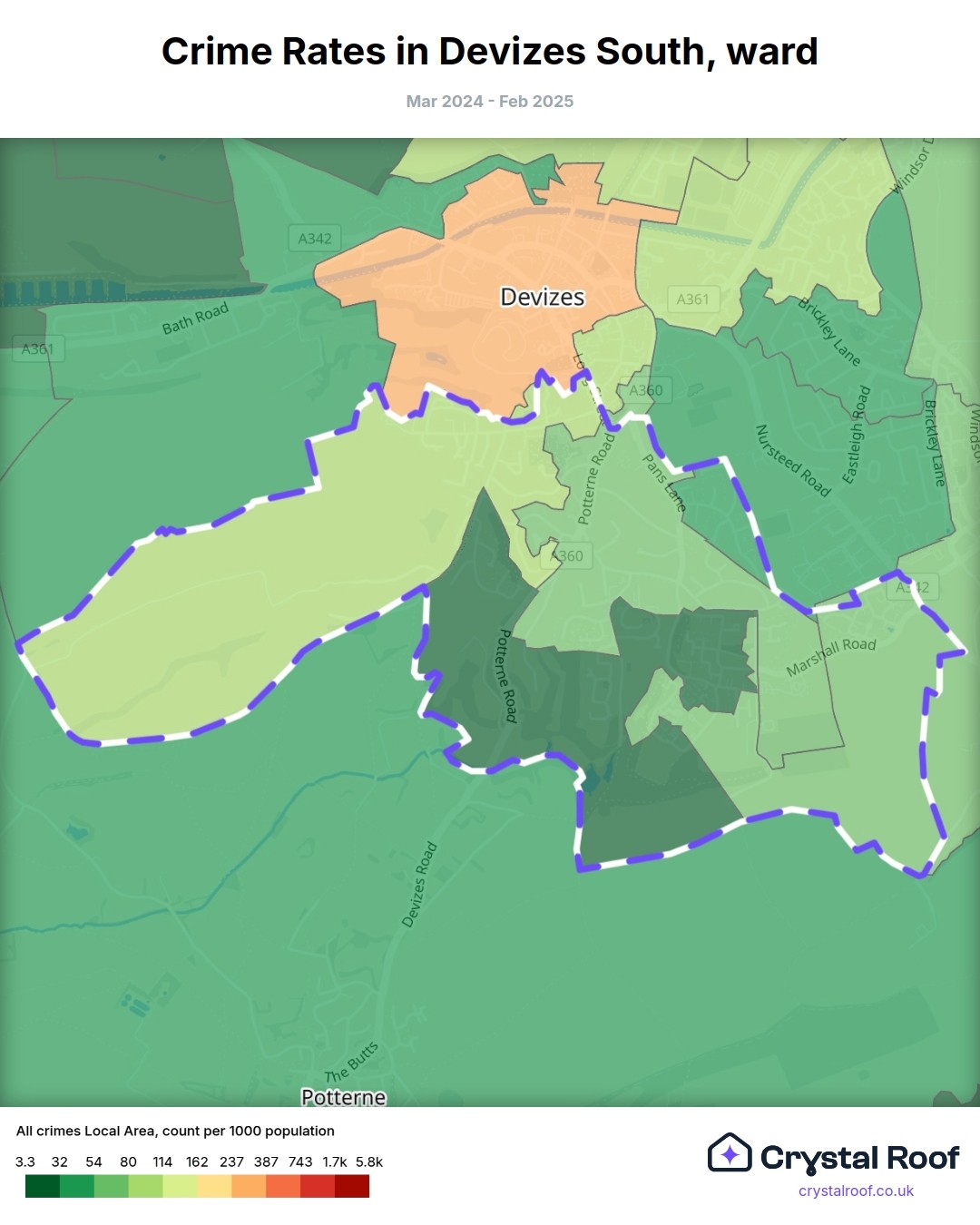 Devizes South, (ward) includes areas with the following crime ratings (see map):