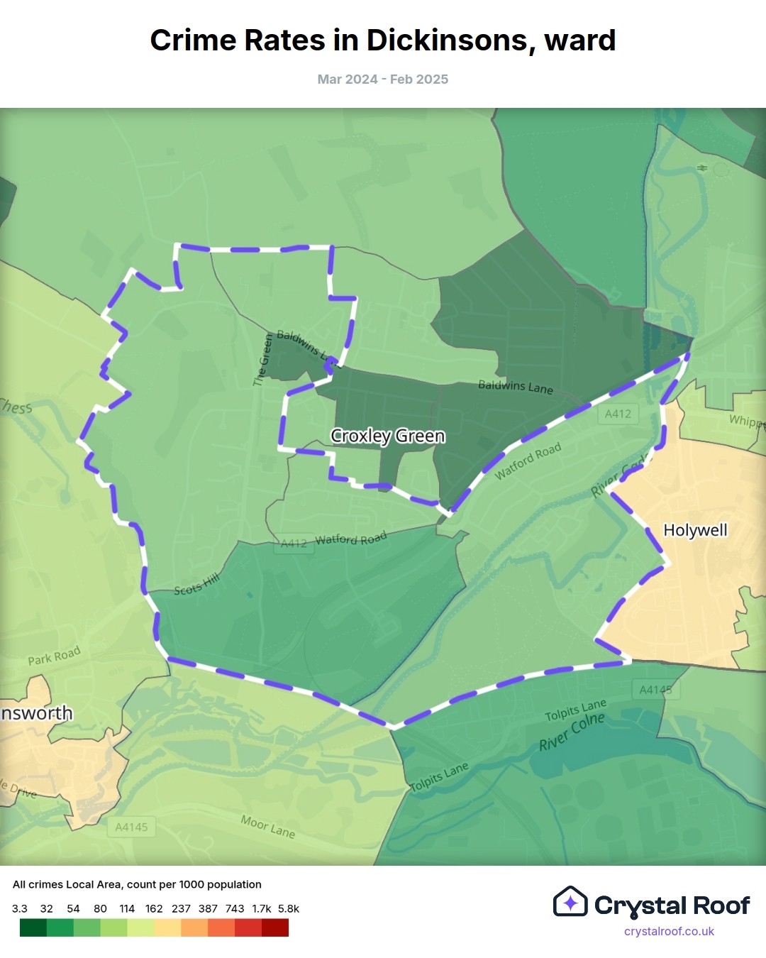 Dickinsons (ward) is located within Three Rivers (borough). Annual total crime rate in Three Rivers (borough) is 68.4 crimes per thousand resident population, which can be rated as 2 out of 10 or low crime level compared to other local authority districts in England and Wales.