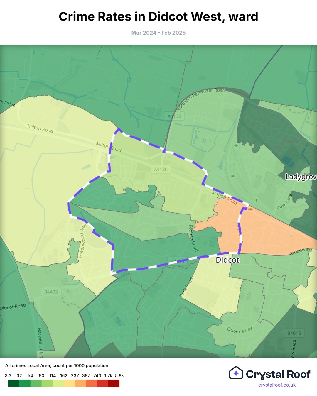 The figures in grey indicate the relative ratings of Didcot West (ward) for a specific crime type compared to other wards in England and Wales.
