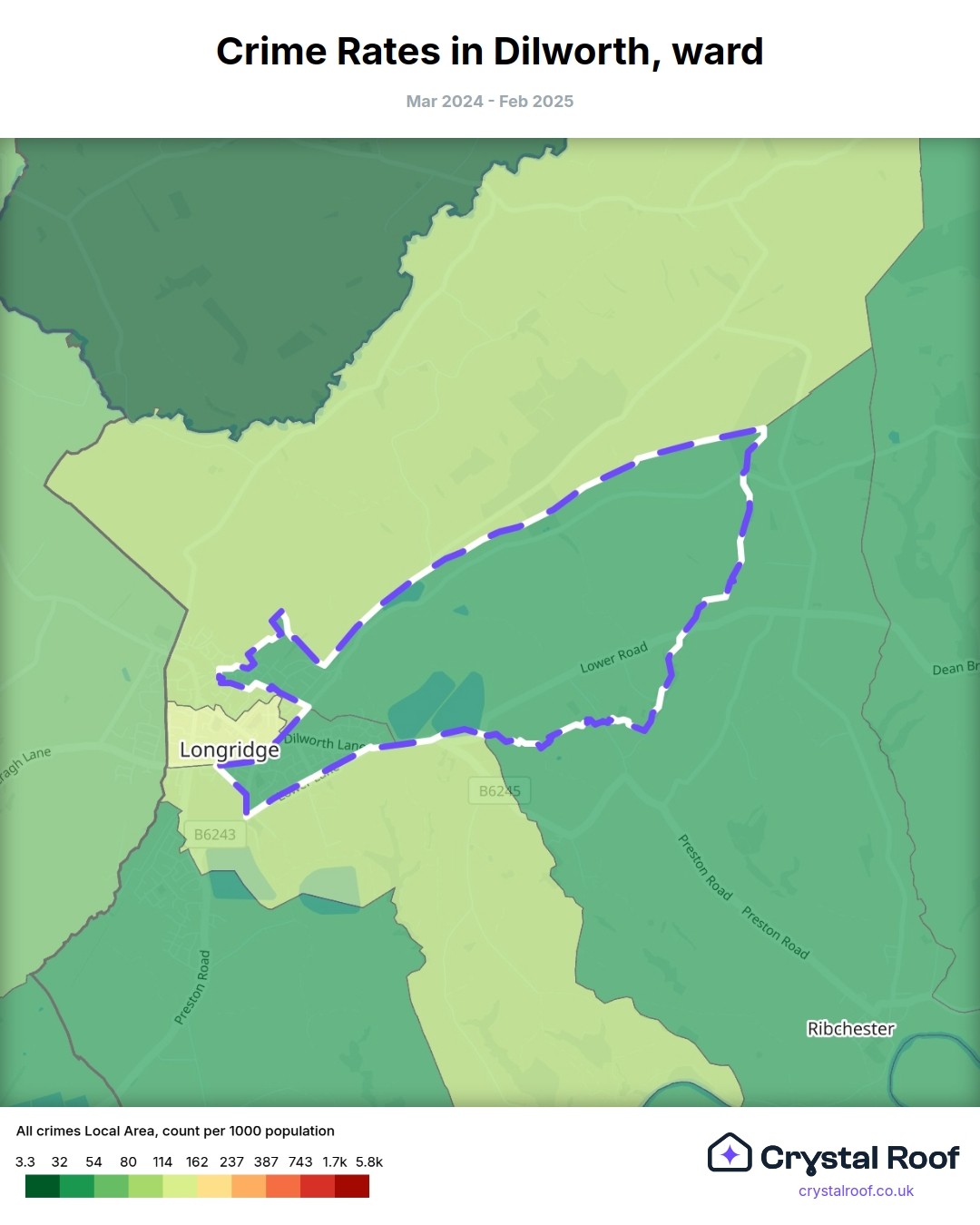 Dilworth (ward) is located within Ribble Valley (borough). Annual total crime rate in Ribble Valley (borough) is 57.8 crimes per thousand resident population, which can be rated as 2 out of 10 or low crime level compared to other local authority districts in England and Wales.