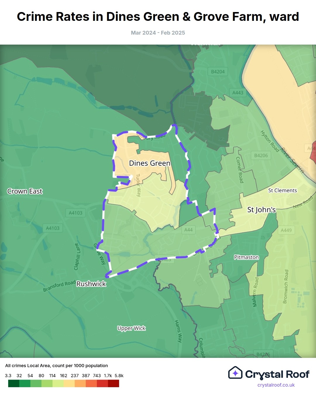 Dines Green & Grove Farm (ward) is located within Worcester (borough). Annual total crime rate in Worcester (borough) is 119 crimes per thousand resident population, which can be rated as 6 out of 10 or medium crime level compared to other local authority districts in England and Wales.