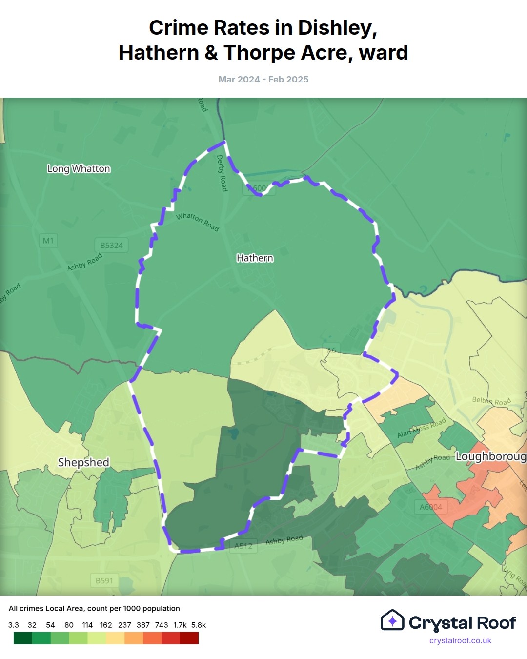 Dishley, Hathern & Thorpe Acre, (ward) includes areas with the following crime ratings (see map):