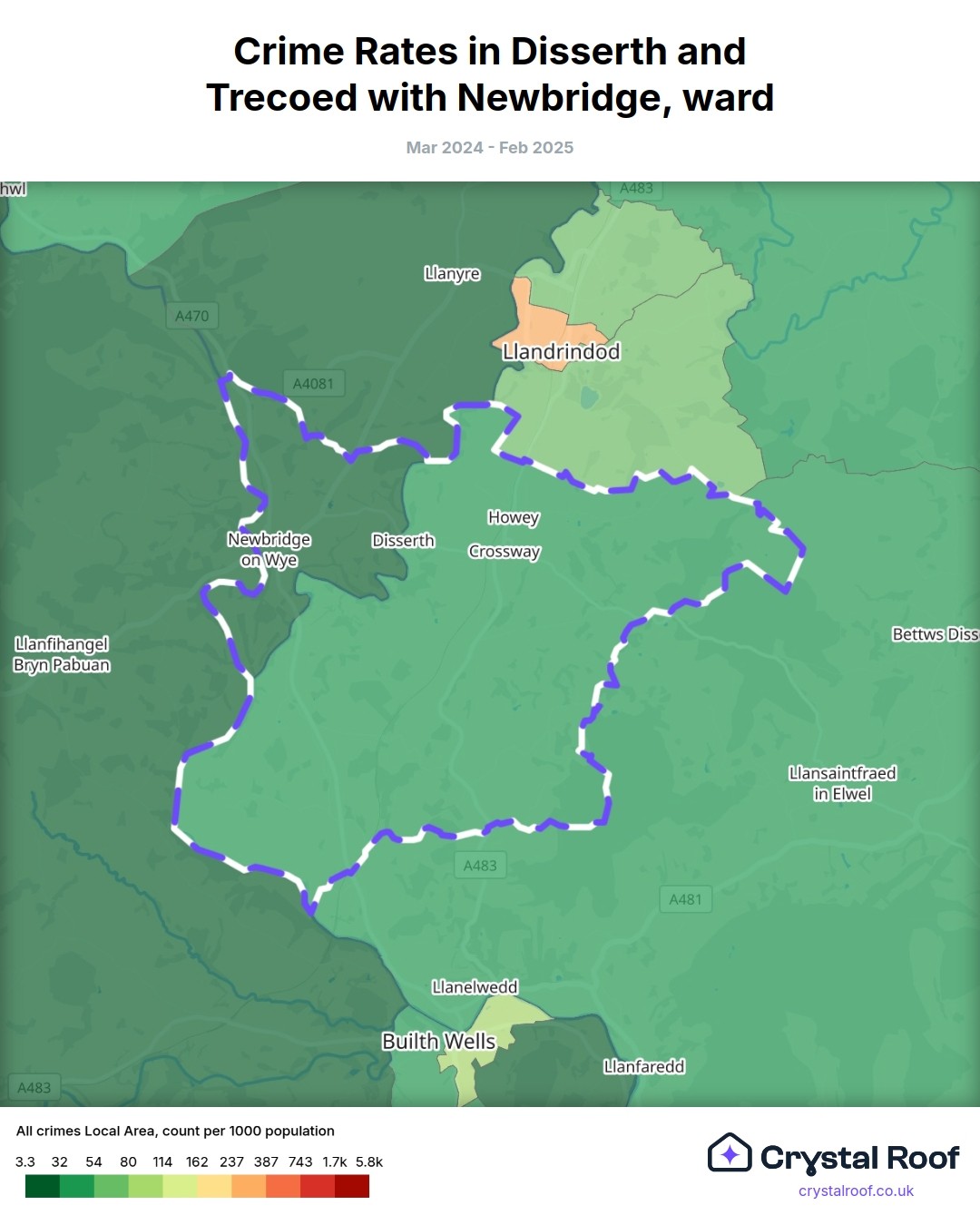 Disserth and Trecoed with Newbridge, (ward) includes areas with the following crime ratings (see map):