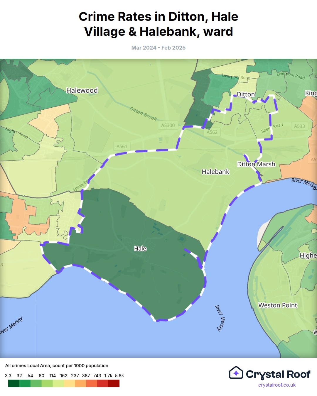Ditton, Hale Village & Halebank, (ward) includes areas with the following crime ratings (see map):