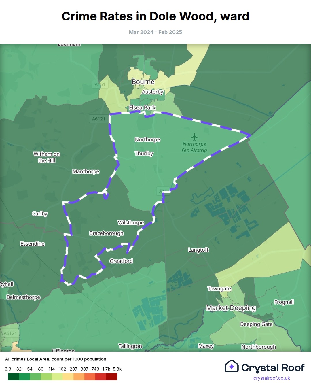 Dole Wood (ward) is located within South Kesteven (borough). Annual total crime rate in South Kesteven (borough) is 70.9 crimes per thousand resident population, which can be rated as 2 out of 10 or low crime level compared to other local authority districts in England and Wales.